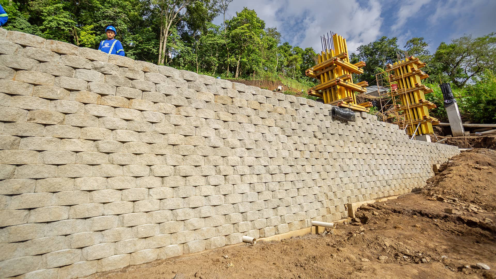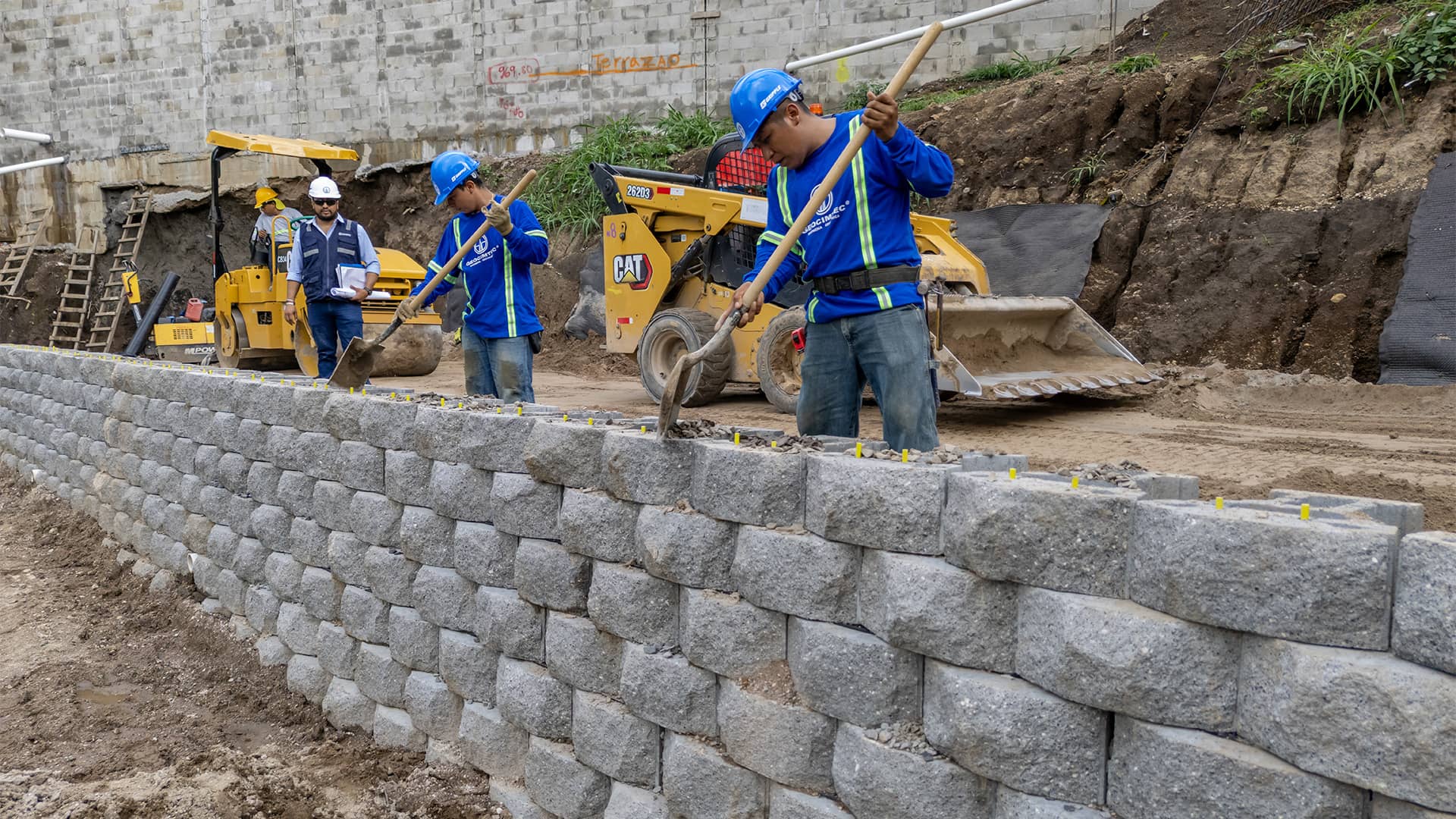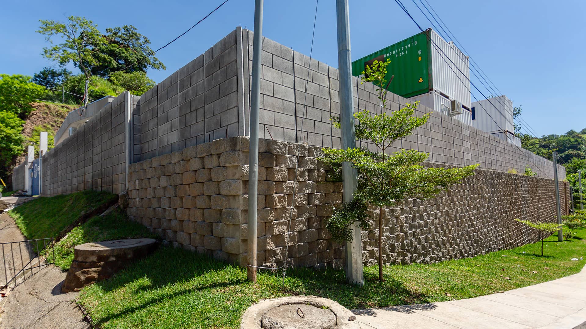 Construcción de muro de tierra mecánicamente estabilizado (MSEW) con sistema KEYSTONE, para conformación de plataforma y recuperación de área útil en un terreno con pendiente pronunciada.